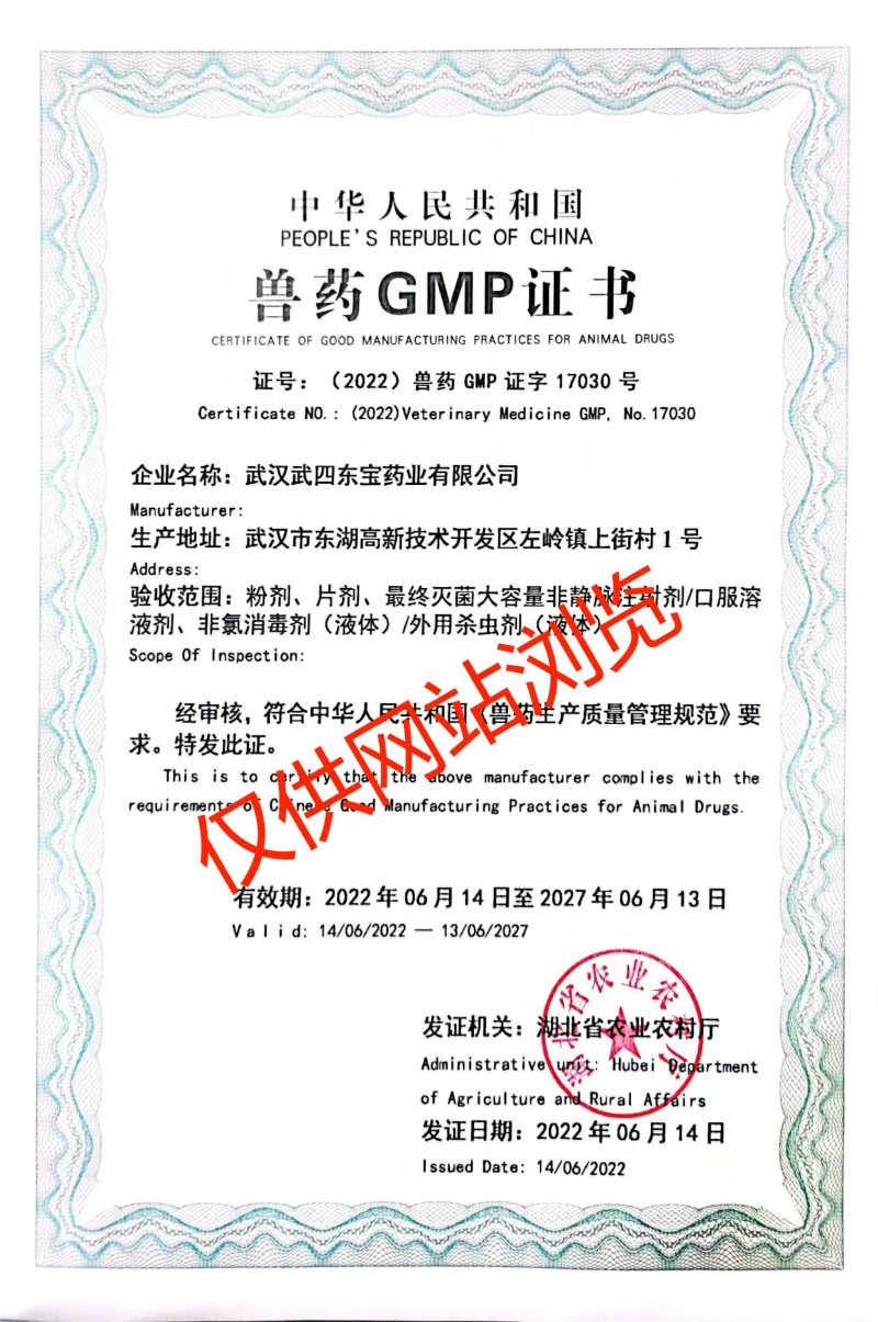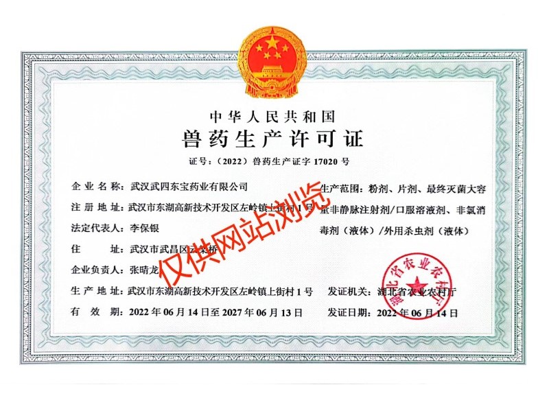 武漢武四東寶藥業(yè)有限公司,是在原武昌獸藥廠(成立于1972年)基礎(chǔ)上發(fā)展而來(lái),公司位于武漢市東湖新技術(shù)開發(fā)區(qū)左嶺工業(yè)園,是一家專業(yè)從事動(dòng)物保健品的研發(fā)、生產(chǎn)、銷售和服務(wù)于一體的高新技術(shù)企業(yè),目前擁有六條生產(chǎn)線、十種劑型(最終滅菌小容量注射劑、最終滅菌大容量非靜脈注射劑、口服溶液劑、粉劑、預(yù)混劑、固體殺蟲劑、液體殺蟲劑、片劑、顆粒劑、液體消毒劑)。公司成立于2004年,2006年全面通過(guò)國(guó)家農(nóng)業(yè)部獸藥GMP認(rèn)證,已成為中國(guó)獸用保健行業(yè)知名企業(yè)之一。武漢武四東寶藥業(yè)有限公司自創(chuàng)建以來(lái),一直秉承著“善、行、學(xué)、成”的核心價(jià)值觀,恪守“一切為了健康養(yǎng)殖”的企業(yè)使命,堅(jiān)持“科技成就價(jià)值,服務(wù)創(chuàng)造未來(lái)”的服務(wù)理念,經(jīng)過(guò)多年不斷的創(chuàng)新與發(fā)展,逐步形成了自己的核心競(jìng)爭(zhēng)力,并在行業(yè)中脫穎而出。公司與中國(guó)農(nóng)業(yè)大學(xué)、華中農(nóng)業(yè)大學(xué)、武漢工程大學(xué)、武漢工業(yè)學(xué)院、中科院水生所等全國(guó)知名院校和科研院所建立了長(zhǎng)期密切的合作關(guān)系,通過(guò)聯(lián)合攻關(guān)和技術(shù)引進(jìn)等方式,研發(fā)出50多種優(yōu)質(zhì)、高效、穩(wěn)定的產(chǎn)品,并深得廣大用戶的認(rèn)可與信賴。公司以“追求健康的用戶群體和卓越市場(chǎng)占有率”為經(jīng)營(yíng)理念,堅(jiān)持以市場(chǎng)為導(dǎo)向,強(qiáng)化科技創(chuàng)新,拓展產(chǎn)品結(jié)構(gòu),努力為我國(guó)健康養(yǎng)殖事業(yè)的發(fā)展作出更大的貢獻(xiàn)!